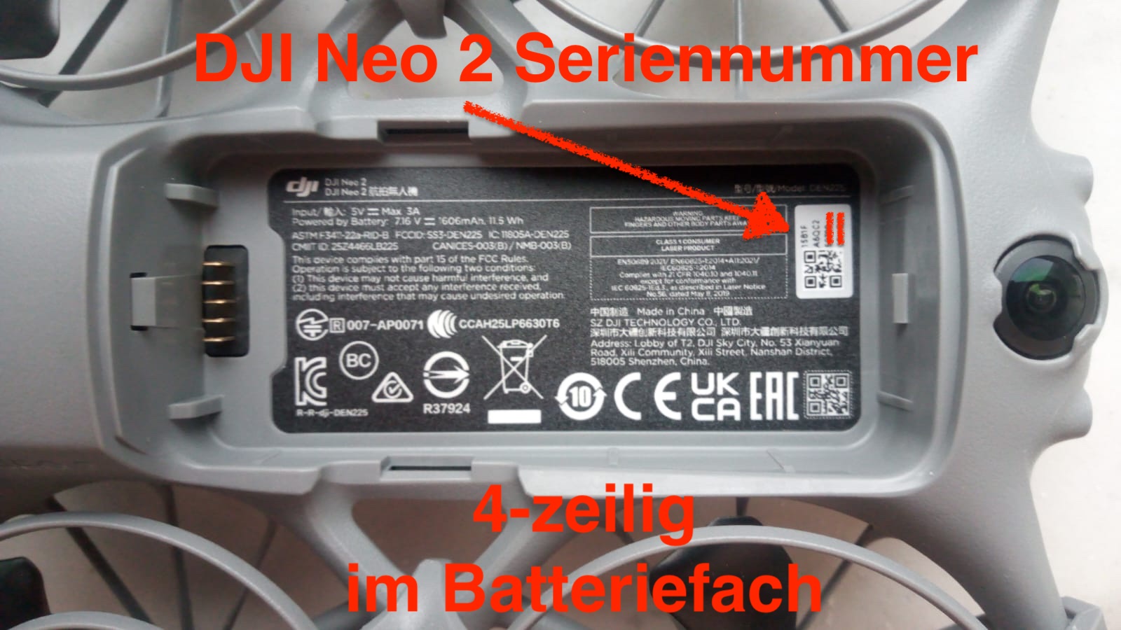 Die Seriennummer der Neo 2 befindet sich typischerweise auf dem Aufkleber im Akkufach bzw. im Batteriefach und auf dem Barcode-Aufkleber der Produktverpackung. Zusätzlich kann die Flight-Controller-Seriennummer in der DJI Fly App unter „Einstellungen > Info / About > Serial Number“ ausgelesen werden. So findet man seine Drohnen Seriennummer >