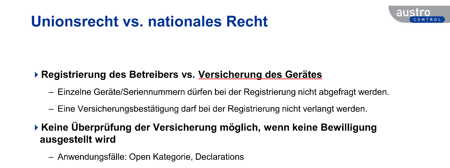- Auf dieser steht wörtlich: "Der Betreiber bestätigt (...) für den Betrieb eine Versicherung abgeschlossen zu haben, welche den Anforderungen des Luftfahrtgesetzes entspricht." (Quelle: Bestätigung der Registrierung als Betreiber unbemannter Luftfahrzeuge, Austro Control)